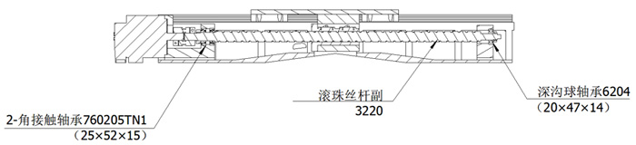 X、Y、Z三個(gè)坐標(biāo)的進(jìn)給運(yùn)動(dòng)由伺服電機(jī)驅(qū)動(dòng),通過(guò)彈性聯(lián)軸器直接將運(yùn)動(dòng)傳遞到絲杠,再由滾珠絲杠副將旋轉(zhuǎn)運(yùn)動(dòng)轉(zhuǎn)化為直線運(yùn)動(dòng)。各軸進(jìn)給傳動(dòng)結(jié)構(gòu)圖及軸承分節(jié)如圖4所示。